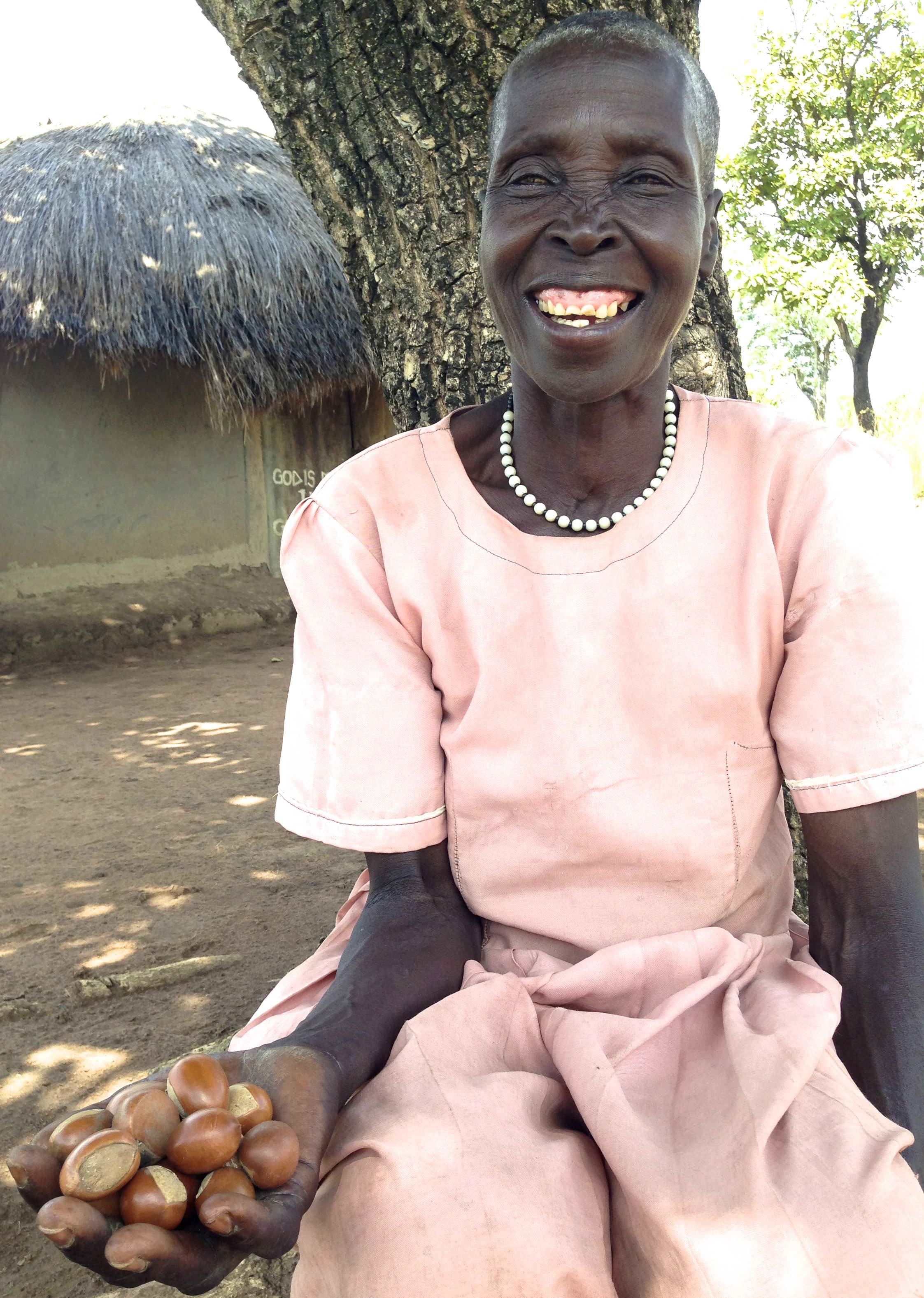 På gårdspladsen ved familiens stråtækte hytte i Otuke i Norduganda sidder Bitoreci Omara under et af de sheatræer, som netop denne egn er rig på. Hun holder en hånd frem med tørrede sheanødder.