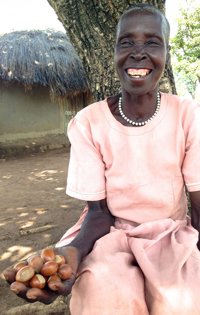 Bitoreci Omara rests in the shade of one of her family’s shea trees in Otuke District in northern Uganda. She holds out a handful of dried shea nuts.